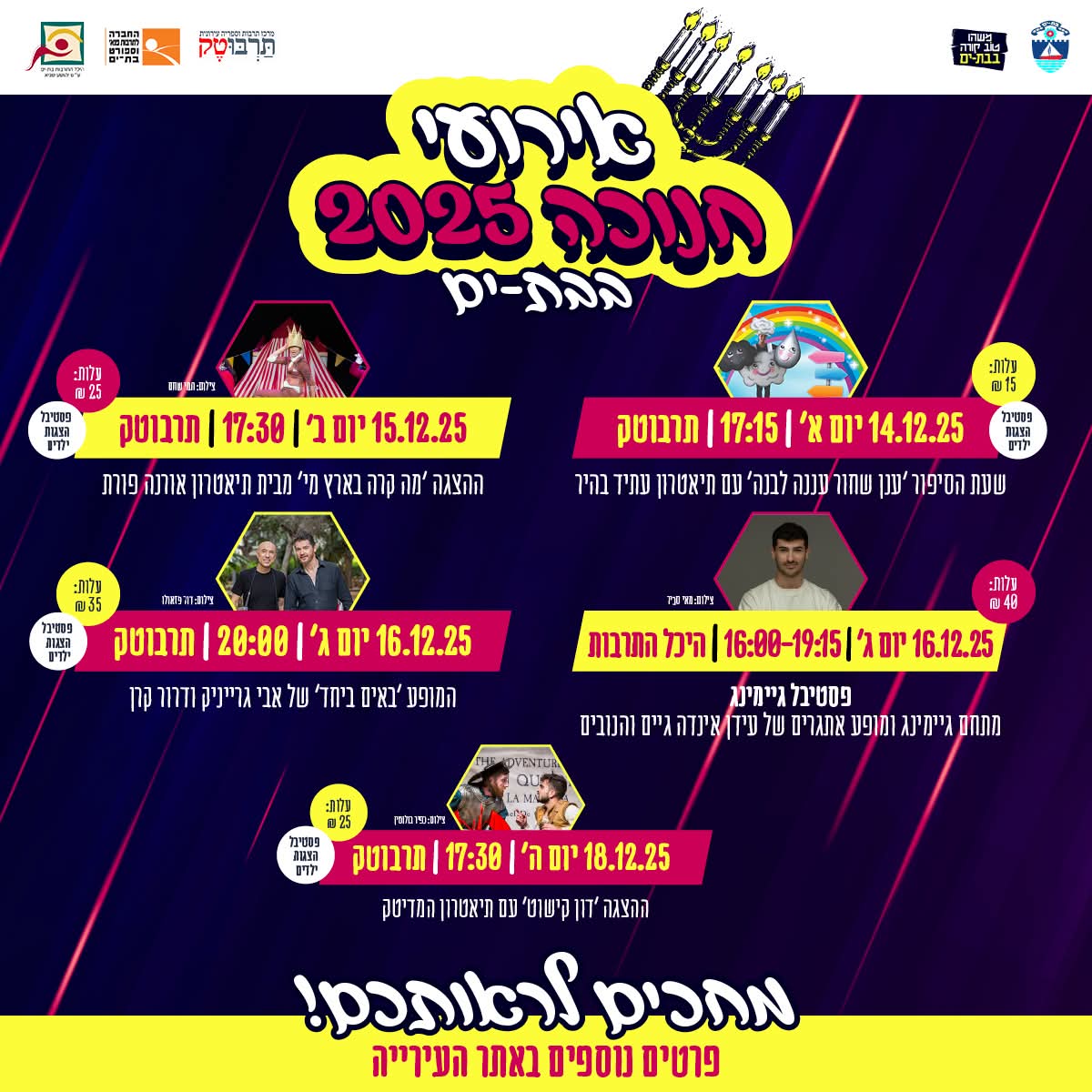 עיריית בת-ים גאה להשיק את אירועי חנוכה לשנת 2025 עם שורה של חגיגות, מופעים, פעילויות קהילתיות ואירועי תרבות שימלאו את העיר באור ובשמחה. גם השנה יש דגש על חוויות איכותיות לכל גיל, נגישות לכל משפחה ומגוון עשיר של תכנים המתקיימים במרכזים השונים ברחבי העיר ובהם: