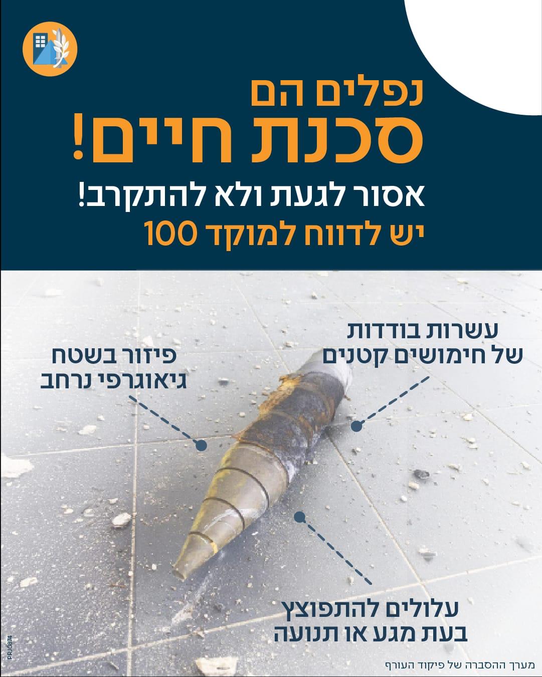 בעירייה מדגישים כי טילי מצרר מכילים חימושים קטנים המתפזרים על פני שטח רחב יחסית. חימושים אלו אינם שברי יירוט, אלא נפלים שעלולים להתפוצץ בעת מגע ועל כן הם מהווים סכנת חיים ממשית. במקרה של זיהוי חפץ חשוד או נפל, יש להתרחק מיד מהמקום, להרחיק סקרנים, ובייחוד ילדים ולדווח באופן מיידי למשטרה במוקד 100. גם אם החפץ נראה קטן או בלתי מזיק, אין לגעת בו בשום אופן.