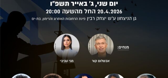 עצרת הזיכרון המרכזית לחללי מערכות ישראל ונפגעי פעולות האיבה Posted on אפריל 20, 2026אפריל 20, 2026 by מערכת מגזין בת-ים אהבתם? שתפו... תושבות ותושבים יקרים, אנו מזמינים אתכם להצטרף לעצרת הזיכרון המרכזית לחללי מערכות ישראל ונפגעי פעולות האיבה שתועבר בשידור חי בפייסבוק העירוני. העצרת תחל בשעה 20:00, עם הישמע הצפירה. מיד בסיום הטקס יחל האירוע "שרים לזכרם". לצפייה לחצו: https://www.facebook.com/100064772592739/posts/pfbid0y2D43ZmJQdu8mVLo1scErcEpkrvhFnHxp5SLAjJFRp2venQkfh5bG16jU52wWYQzl/ פרסומת Post Views: 423 אהבתם? שתפו...