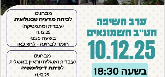 ערב חשיפה חט"ב חשמונאים בת ים Posted on דצמבר 5, 2025 by מערכת מגזין בת-ים אהבתם? שתפו... הזדמנות להצטרף לבית הספר הראשון בעיר! ערב חשיפה במקיף חשמונאים מתקרב, שריינו את יום רביעי הקרוב, 10.12.25 בשעה 18:30. הרישום למבחנים ולראיונות ייערך בערב זה. פרטים נוספים בפלייר המצורף. פרסומת Post Views: 222 אהבתם? שתפו...