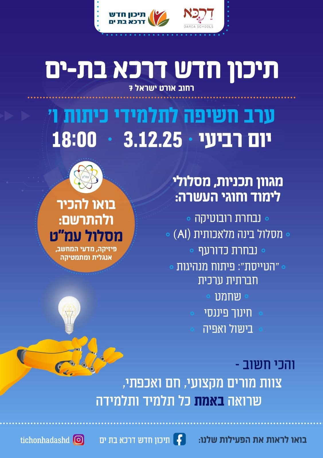 ערב חשיפה לתלמידי כיתות ו' – בבית ספר תיכון חדש דרכא בת ים Posted on נובמבר 27, 2025 by מערכת מגזין בת-ים אהבתם? שתפו... תפתחו יומנים 🗓 3.12.25 תיכון חדש דרכא בת-ים – ערב חשיפה לתלמידי כיתות ו'. בואו להכיר ולהתרשם ממגוון התוכניות, מסלולי הלימוד וחוגי ההעשרה. שי לכל משתתף 🎁 יום רביעי בשעה 18:00 אורט ישראל 7 בת-ים. טלפון לשאלות ובירורים: 03-5510431 פרסומת Post Views: 145 אהבתם? שתפו...