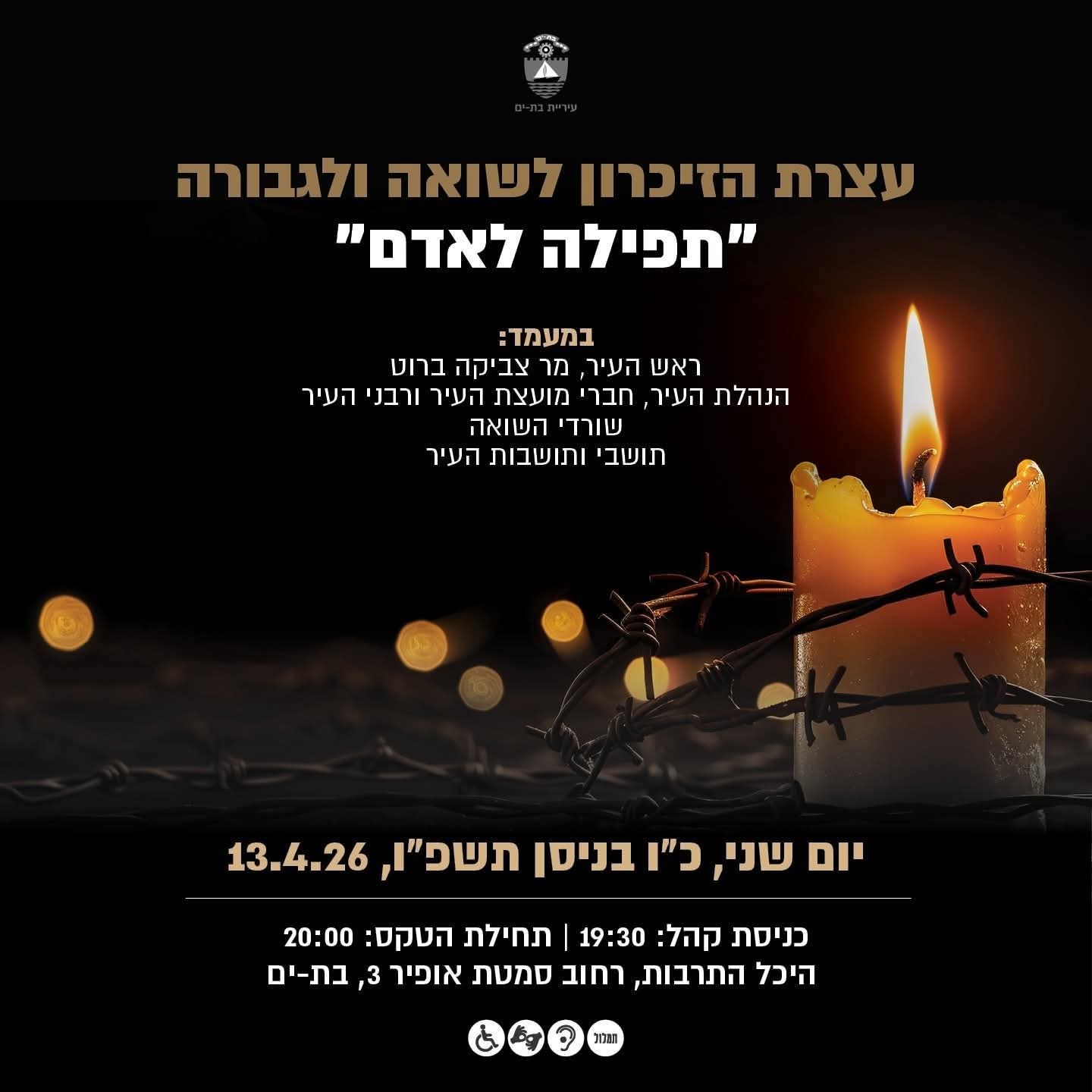 עצרת הזיכרון המרכזית לשואה ולגבורה תתקיים בסימן הנושא השנתי: "תפילה לאדם", ביום שני, 13 באפריל 2026, כ״ו בניסן תשפ״ו, בשעה 19:30, בהיכל התרבות בת-ים.