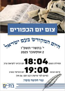 צום יום הכיפורים 2025 – מועדי הצום ופרטים חשובים לתושבי בת ים