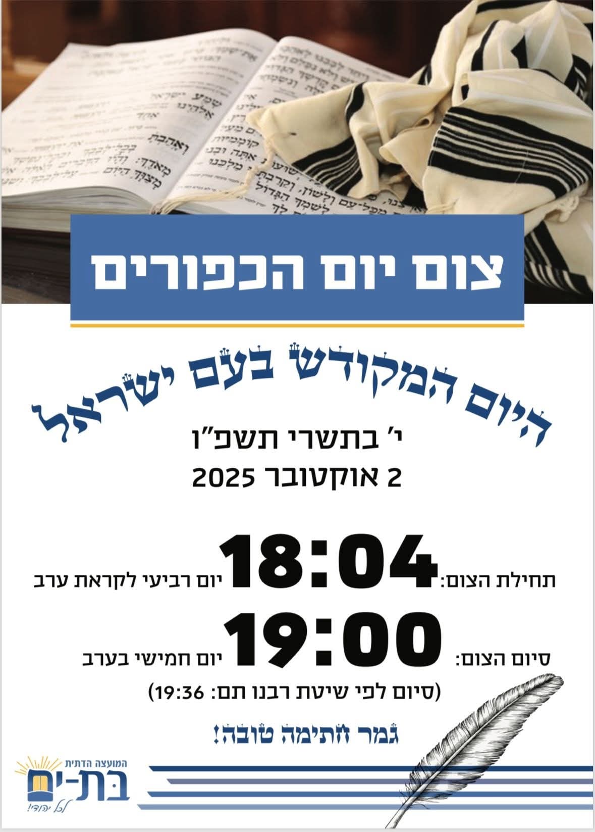 עיריית בת ים פרסמה את לוח הזמנים לצום יום הכיפורים לשנת תשפ"ו (2025), ומזמינה את כלל התושבים לציין את היום הקדוש ברוח של אחדות, סליחה והתבוננות פנימית.