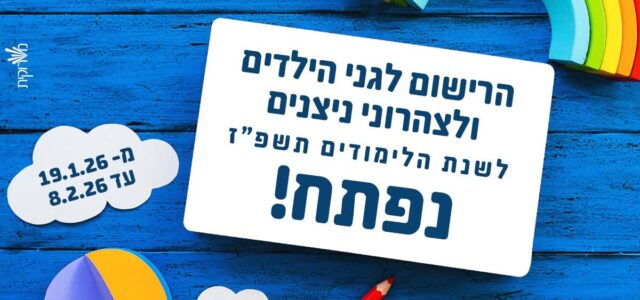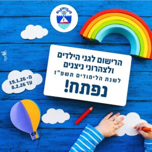 הרישום לגני עירייה ולצהרוני ניצנים בבת-ים לשנת הלימודים תשפ"ז ייפתח בתאריך 19.1.2026 ויימשך עד לתאריך 8.2.2026.